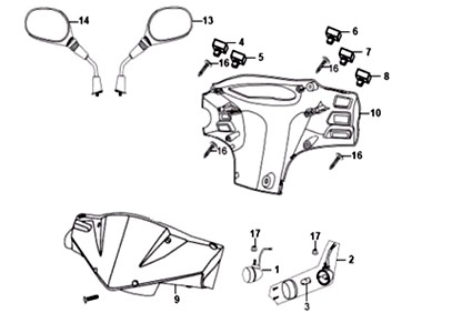 Подбор запчастей SYM Orbit 50 (AV05W-6 AAA) КУЗОВ / ЭЛЕКТРИКА ЗЕРКАЛА * ОБЛИЦОВКА РУЛЯ